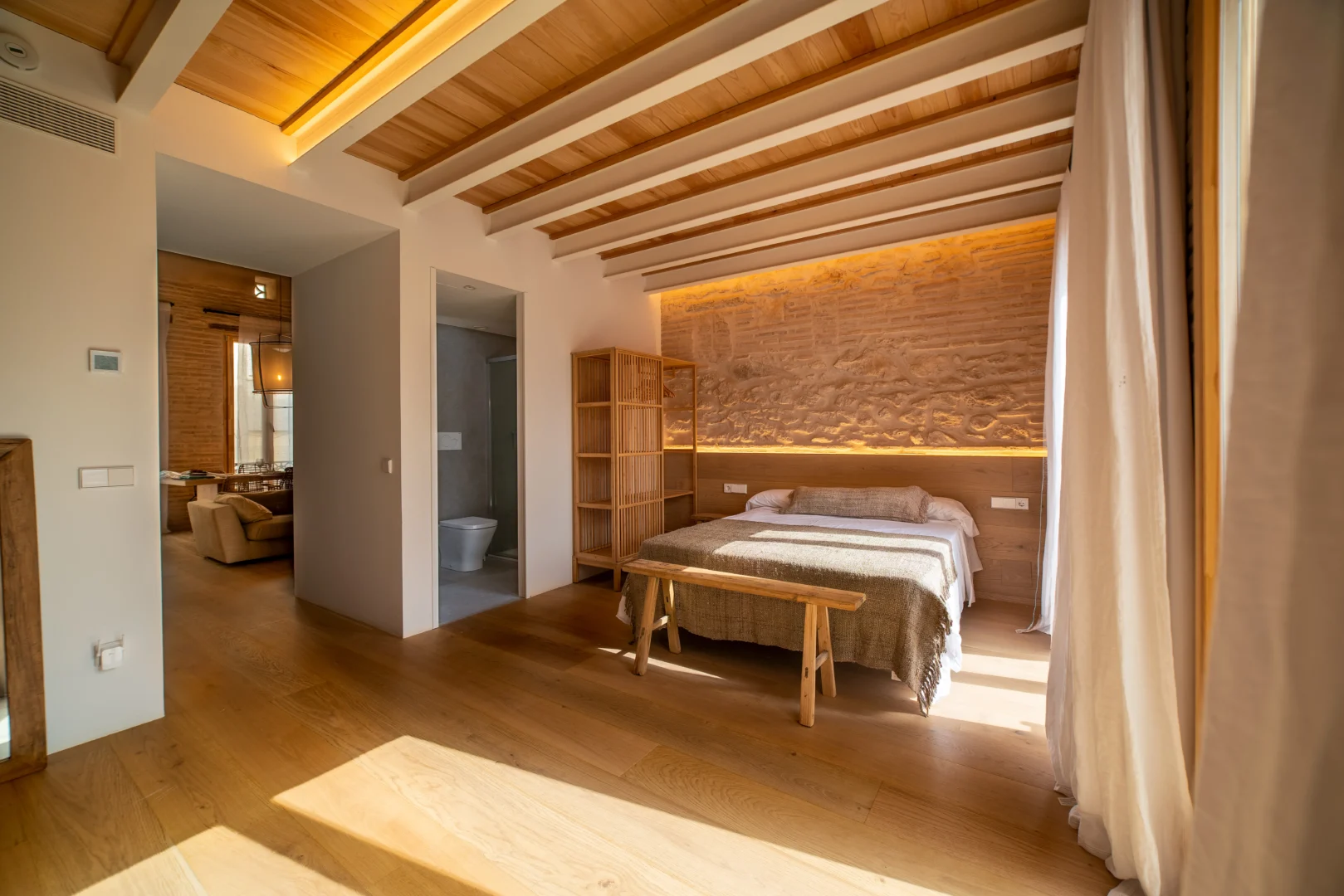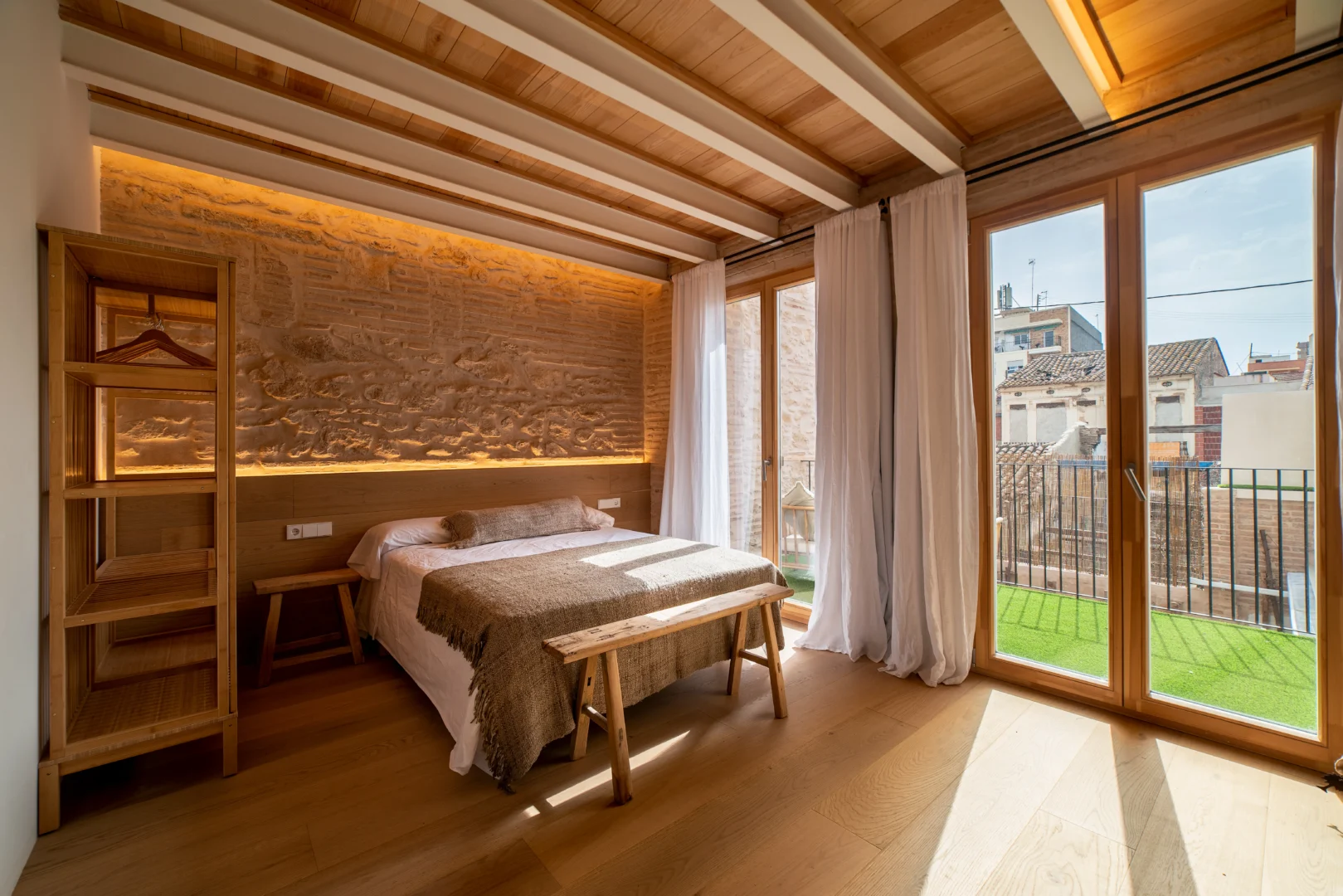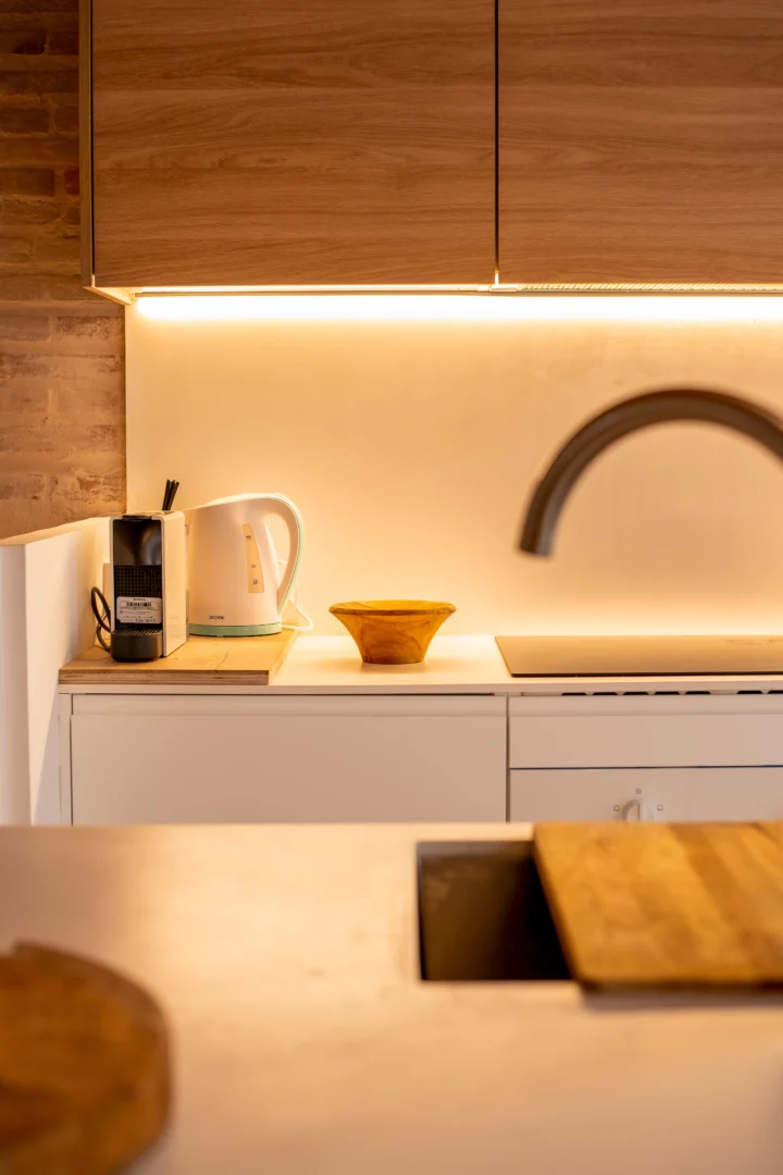 Disfruta de un loft de diseño cerca del mar en Valencia, a solo unos pasos de la playa. Con techos altos de madera, grandes ventanales y un acogedor espacio de concepto abierto, este alojamiento vacacional de estilo mediterráneo combina el encanto histórico con el confort moderno.